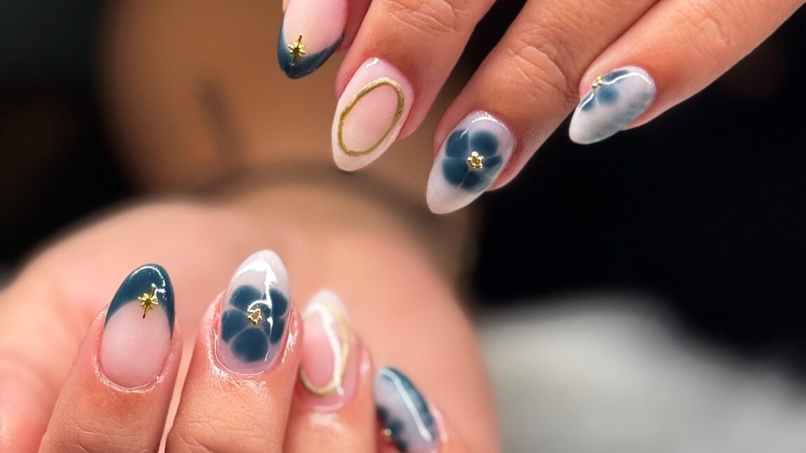 Blended blues, soft petals, and golden accents come together in a manicure that feels like art. Perfect for the bold and the elegant, this look reflects both serenity and strength.